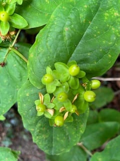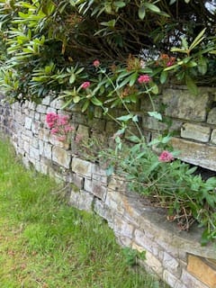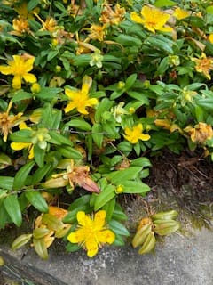 Flowers growing in the garden including Golden cup (St John’s Wort) - the yellow flower and Valerian (pink flower)